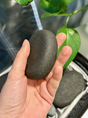 2) I will have heated smooth basalt stones (volcanic rocks that retain heat well) to a safe, therapeutic temperature. I will be able to hold these in my bare hadn the entire treatment. I will ask you to lie comfortably on the massage table as you would with a regular massage. You will either be laying on your back or your stomach.